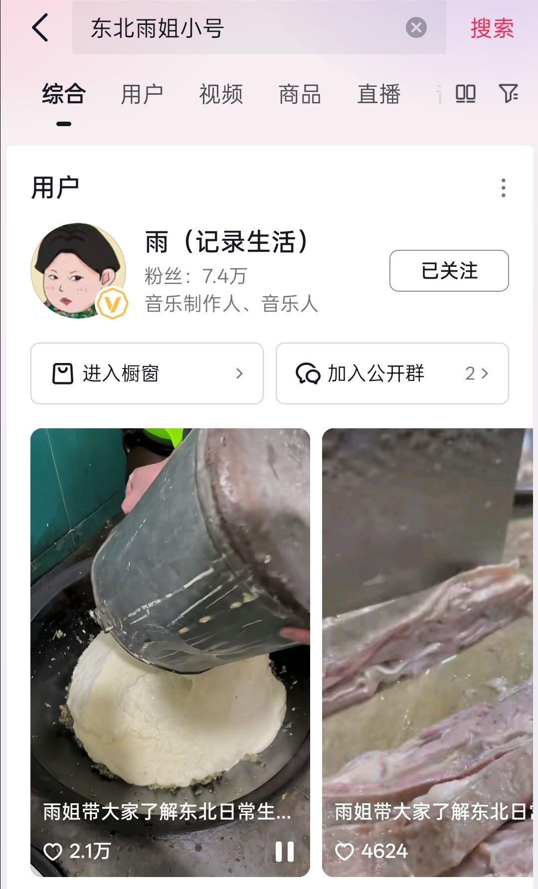 在短视频平台搜索小号账号“东北雨姐姐”,突然出现了这个账号。