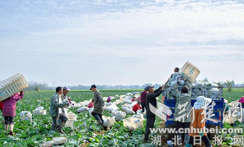 荆楚网(湖北日报网)(致钟国庆、王星海)11月20日,在钟祥市丰乐镇前锋村白菜基地,裹着翠绿外衣的白菜继续“撒”遍田间。村民们忙着对刚收获的白菜进行分类、装袋,并用车搬运。蓝白相间的农用三轮车接送着他们。收获的喧嚣被微笑包裹着。这是该村“产销两旺”的生动例证。